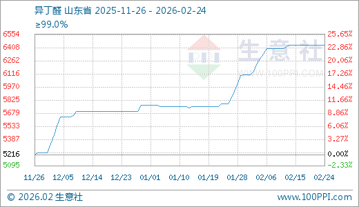 02月24日异丁醛6433.33元/吨 30天上涨11.24%