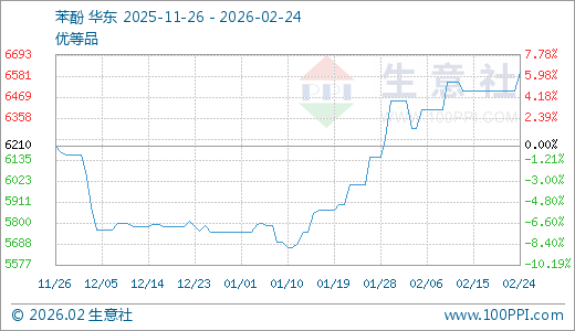 02月24日苯酚6600.00元/吨 30天上涨10.00%