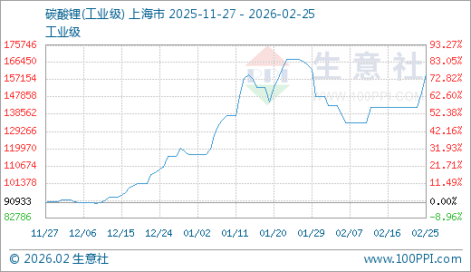 据生意社监测,碳酸锂02月25日最新价格162000.00元/吨,最近5天上涨11.72%,15天上涨19.12%,60天上涨37.60%。