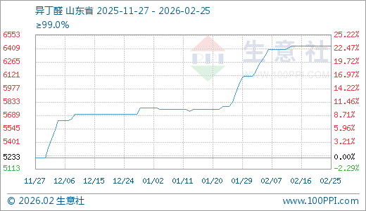 02月25日异丁醛6433.33元/吨 30天上涨10.29%