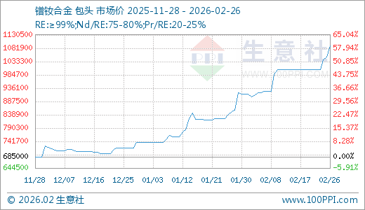 02月26日镨钕合金1090000.00元/吨 5天上涨8.46%