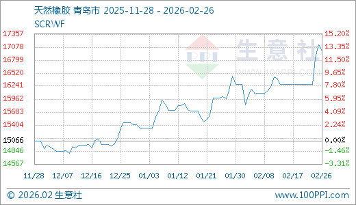 02月26日天然橡胶17000.00元/吨 5天上涨4.40%