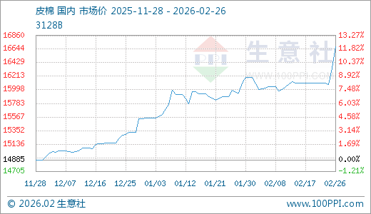 据生意社监测,皮棉02月26日最新价格16680.67元/吨,最近5天上涨3.57%。