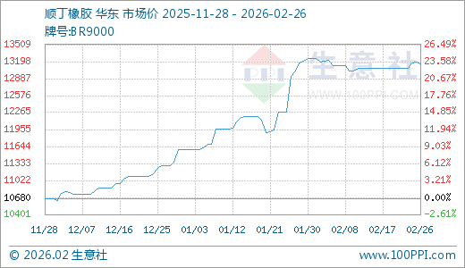 02月26日顺丁橡胶13150.00元/吨 60天上涨16.37%
