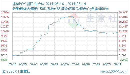 08月14日涤纶POY价格9976.25元/吨 90天上涨10.64%