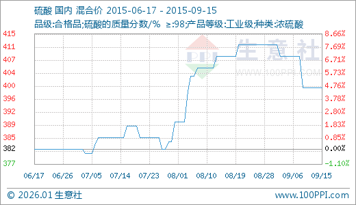 09月15日硫酸400.00元/吨 90天上涨4.65%