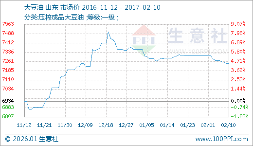 02月10日大豆油7242.67元/吨 90天上涨4.44%