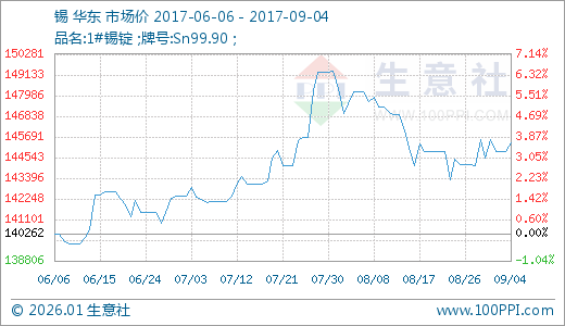 据生意社监测,锡09月04日最新价格145387.50元/吨,最近90天上涨3.65%。