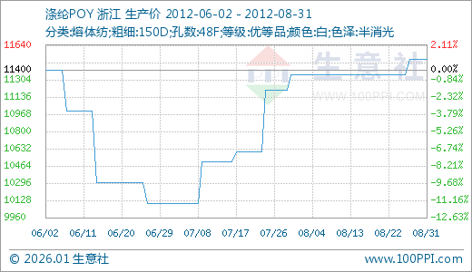 据生意社监测,涤纶POY 08月31日最新价格11500.00元/吨,最近30天上涨5.02%,60天上涨16.46%。
