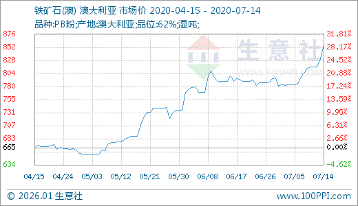 据生意社监测,铁矿石07月14日最新价格856.78元/吨,最近5天上涨5.23%,10天上涨9.47%,60天上涨24.73%。