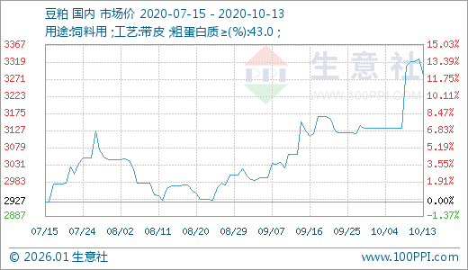 10月13日豆粕3282.50元/吨 5天上涨4.70%