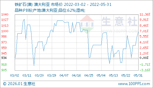 据生意社监测,铁矿石05月31日最新价格1000.11元/吨,最近5天上涨6.87%。