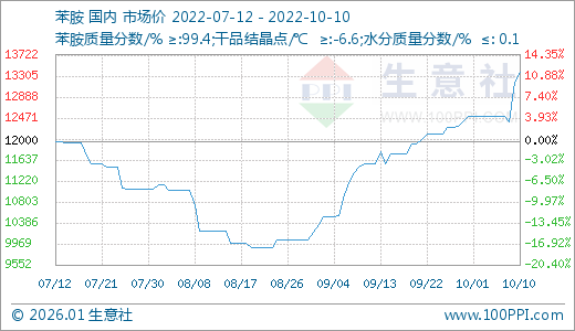 10月10日苯胺13375.00元/吨 5天上涨7.00%
