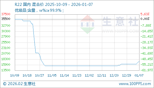 据生意社监测,R22 01月07日最新价格17333.33元/吨,最近5天上涨6.67%,15天上涨10.05%,20天上涨11.83%。