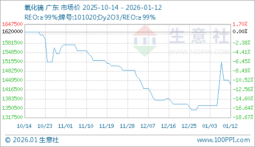 据生意社监测,氧化镝01月12日最新价格1435000.00元/吨,最近10天上涨5.51%。