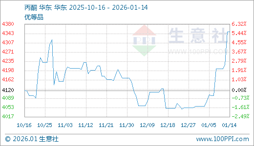 01月14日丙酮4350.00元/吨 5天上涨3.45%