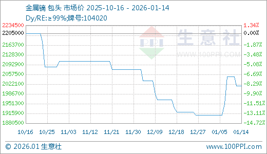 据生意社监测,金属镝01月14日最新价格2015000.00元/吨,最近10天上涨5.50%。