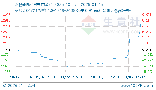 01月15日不锈钢板12941.67元/吨 5天上涨4.51%