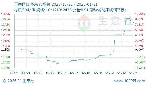 01月21日不锈钢板12808.33元/吨 15天上涨7.71%