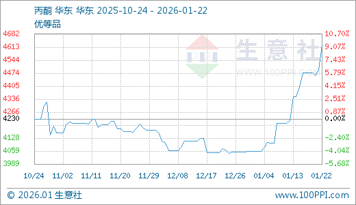 01月22日丙酮4625.00元/吨 5天上涨3.35%
