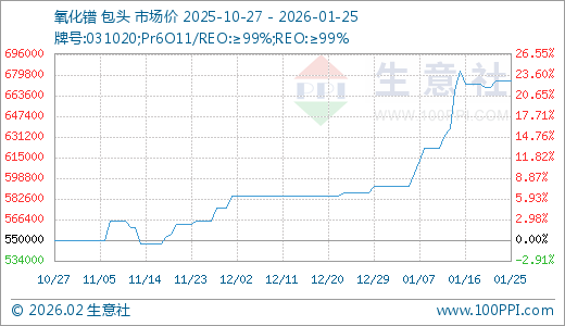 01月25日氧化镨675000.00万元/吨 15天上涨8.43%
