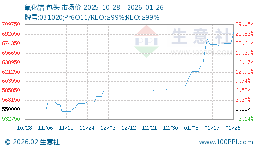 01月26日氧化镨695000.00万元/吨 5天上涨3.73%