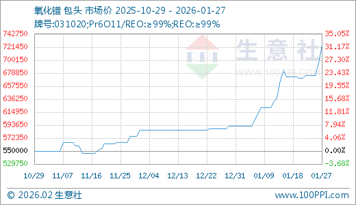 01月27日氧化镨725000.00万元/吨 5天上涨7.41%