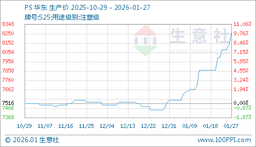 01月27日PS价格8266.67元/吨 5天上涨3.33%