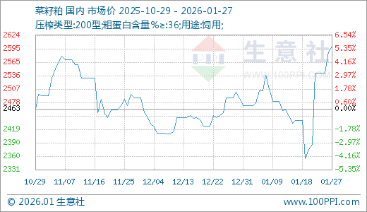 01月27日菜籽粕2600.00元/吨 10天上涨6.64%