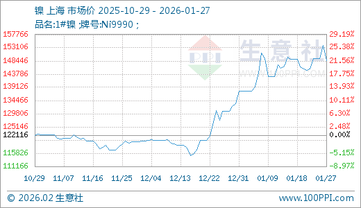 01月27日镍148500.00元/吨 30天上涨13.75%