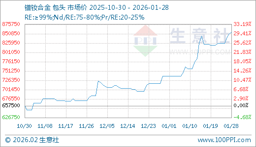 01月28日镨钕合金855000.00元/吨 5天上涨3.64%