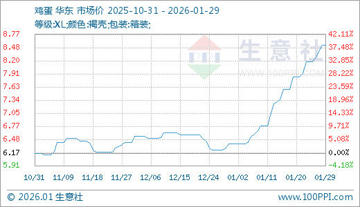 据生意社监测,鸡蛋01月29日最新价格8.53元/公斤,最近5天上涨4.28%,10天上涨8.66%,15天上涨16.85%,20天上涨25.81%,30天上涨33.70%。
